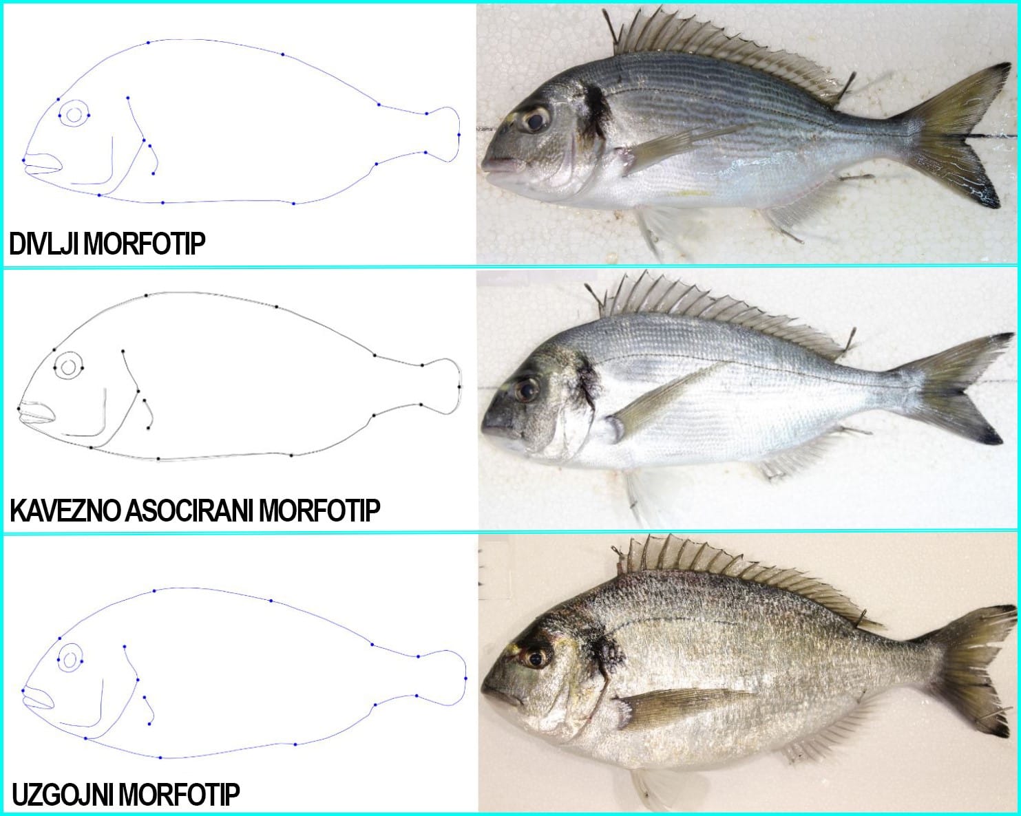 Dodatni izazov bio je kavezno asocirani morfotip orade, čiji je oblik tijela suptilno, okolišno uvjetovan i morfološki vrlo blizak divljim jedinkama, što značajno otežava razlučivanje podrijetla orada. Više o toj pojavi može se pročitati u linku: https://tinyurl.com/rk2wyszc